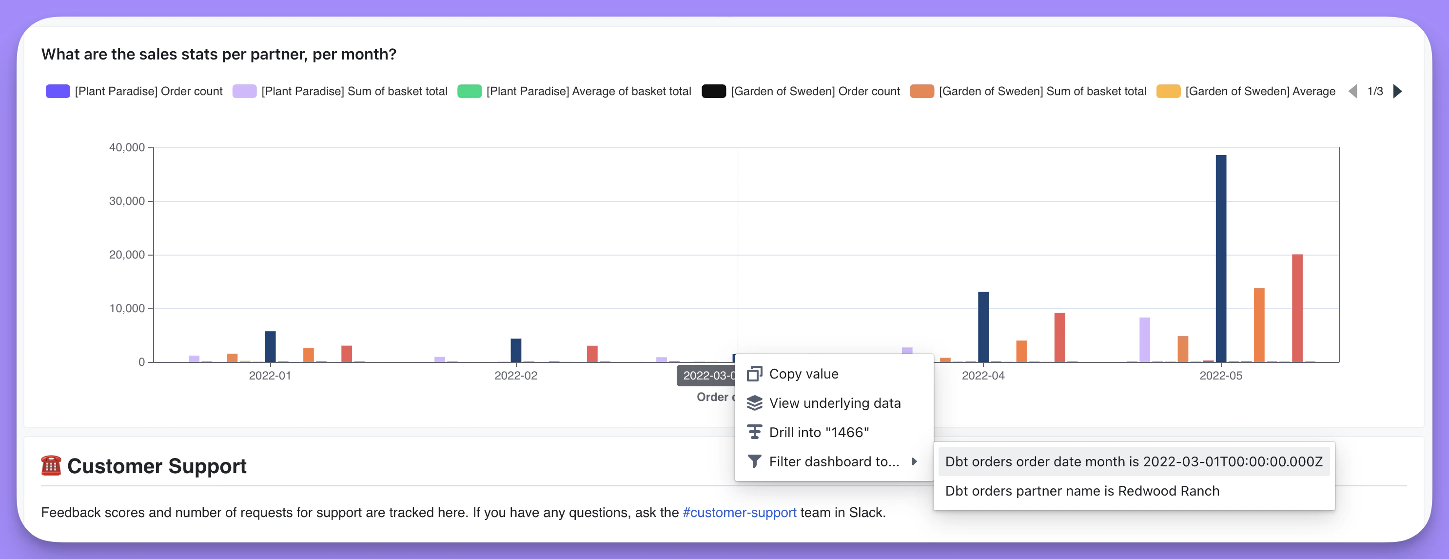 I have a chart with Sum of basket total (a Metric) per Partner, per month. As you can see, there’s a high spike in sales for one of the partners in the month of May. I want to understand why this spike happened. To do this, I click on the data point in my chart, then clickDrill into in the action menu: