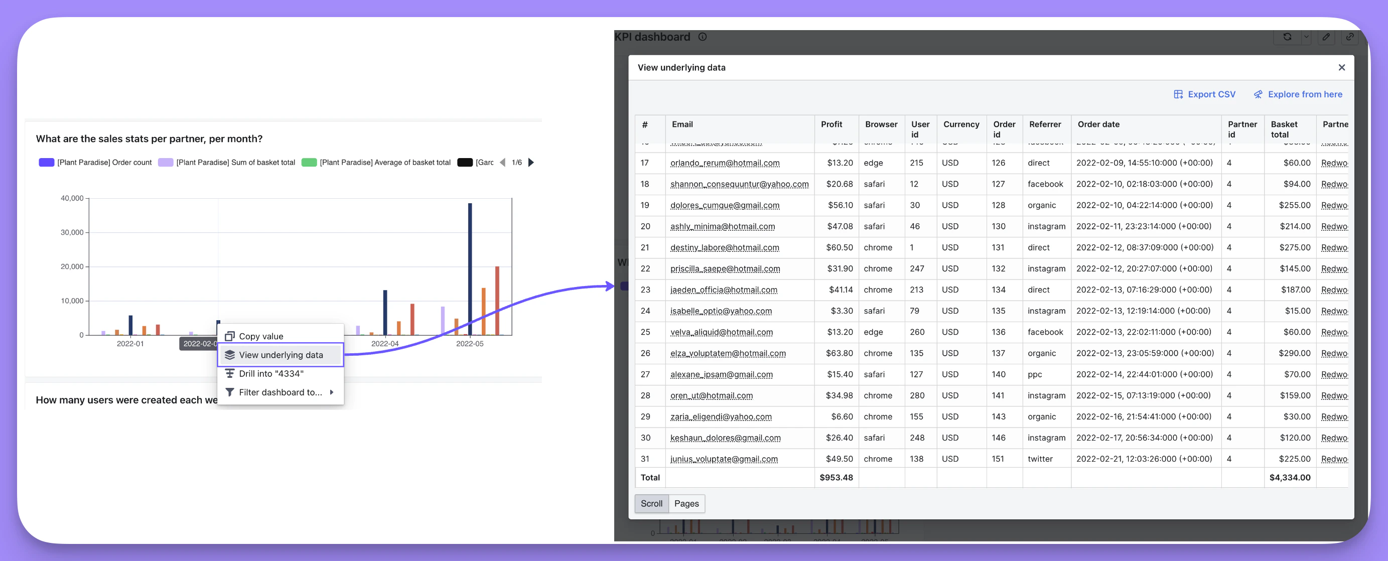 You can click on any point on a chart and view the records which make up that data point. For example, I can find out what the underlying data is for the $4,334.0 in myWhat are the sales stats per partner, per month? chart, by clicking on the bar for that month, and then clicking View underlying data in the action menu. I’d see all of the rows in the underlying table that make up that total.