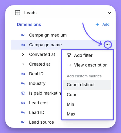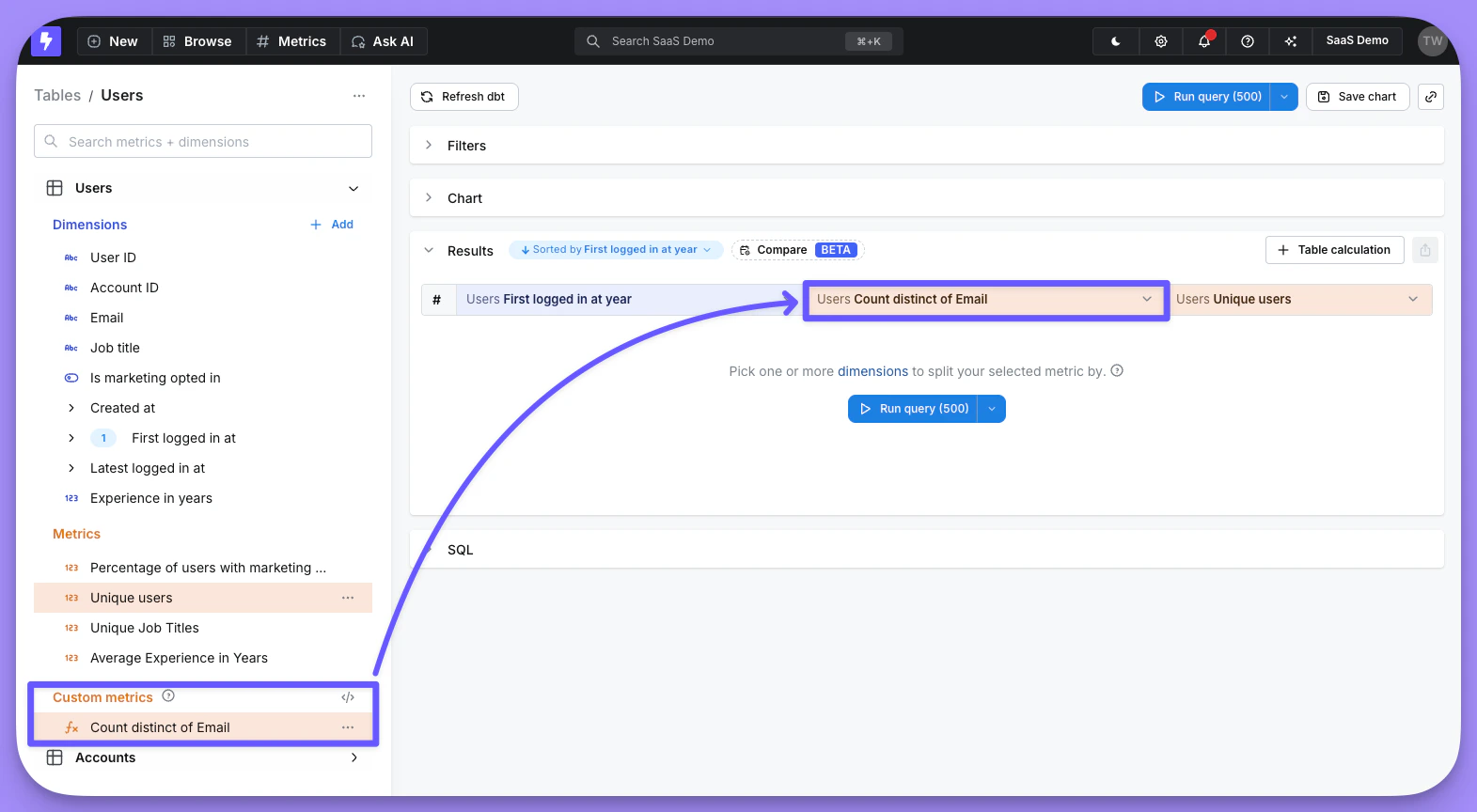 Custom metrics are only saved in the chart they’re used in and will not be saved in the list ofmetrics available if you open the same Table to build a new chart. Metrics written to your dbt project (or YAML metrics) are reusable by everyone in your project and will always show up in the side bar of available metrics for a Table. We recommend writing back custom metrics that you’re using/creating frequently so they become reusable, governed and available for everyone else to build from.