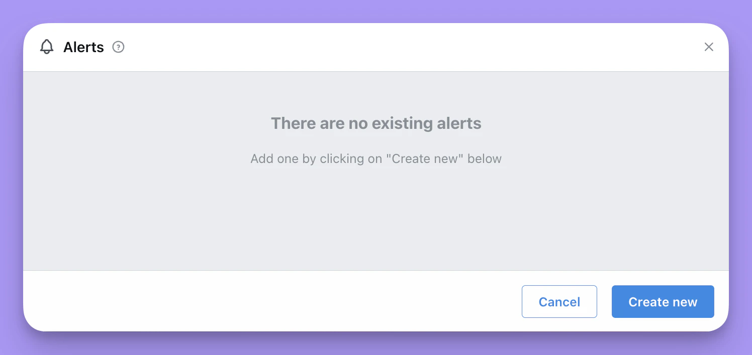 Only users with admin, developer or edit access can create alerts. To create an alert, click on the three-dot menu in the top-right corner of your chart, then click onAlerts.