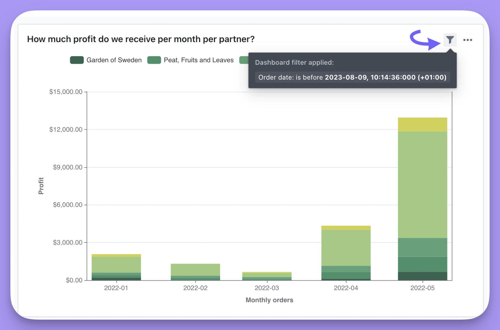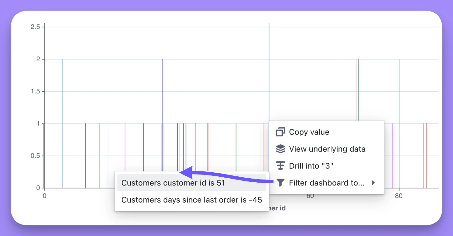 Here’s another example using a date filter: If my original saved chart was filtered to only include orders completed on or after April 3rd, 2024. But, I add a date filter to my dashboard to include orders completed on or after August 1st, 2024, then the dashboard filter would override the saved chart filter and I’ll end up with the chart filtered by orders completed on or after August 1st, 2022.