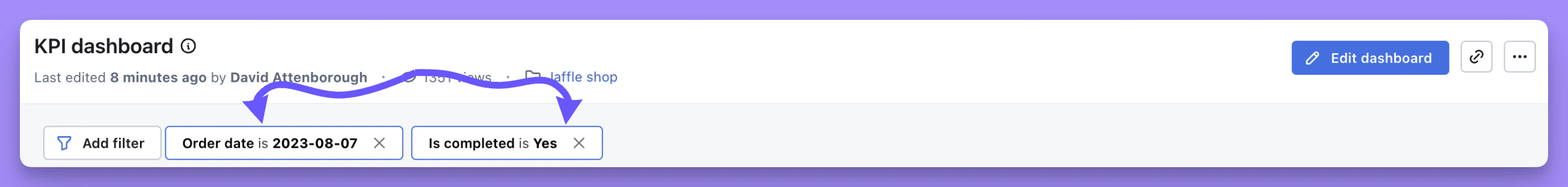 Add filters button on a dashboard. Head to edit mode and toggle the eye icon next to the Add filters dropdown to hide or show it. When hidden, end users are restricted to only using filters that have been specifically set up in dashboard edit mode.Adding temporary filters using the add filters button